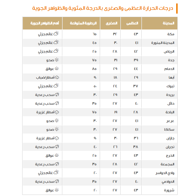 أيضًا جاء تحذير آخر من الرياح التي وصلت سرعتها إلى 60 كم/ ساعة وهي ما تعمل على إثارة الغبار والأتربة، كذلك لم تقم الأرصاد بتفويت إطلاق تحذير من الضباب الذي يتكون في سماء جازان وعسير في الصباح الباكر والليل المتأخر، وأخيرًا جاء عرض شامل لدرجات الحرارة المرصودة كما يلي: