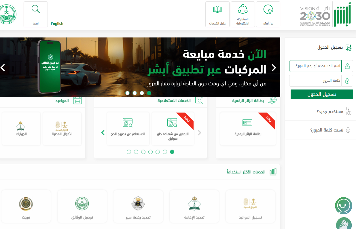 قم بزيارة موقع "منصة أبشر" وسجل دخولك إلى حسابك.
