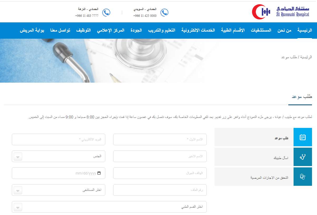 يجب الدخول إلى الموقع الإلكتروني الرسمي الخاص بمستشفى الحمادي من هنا.