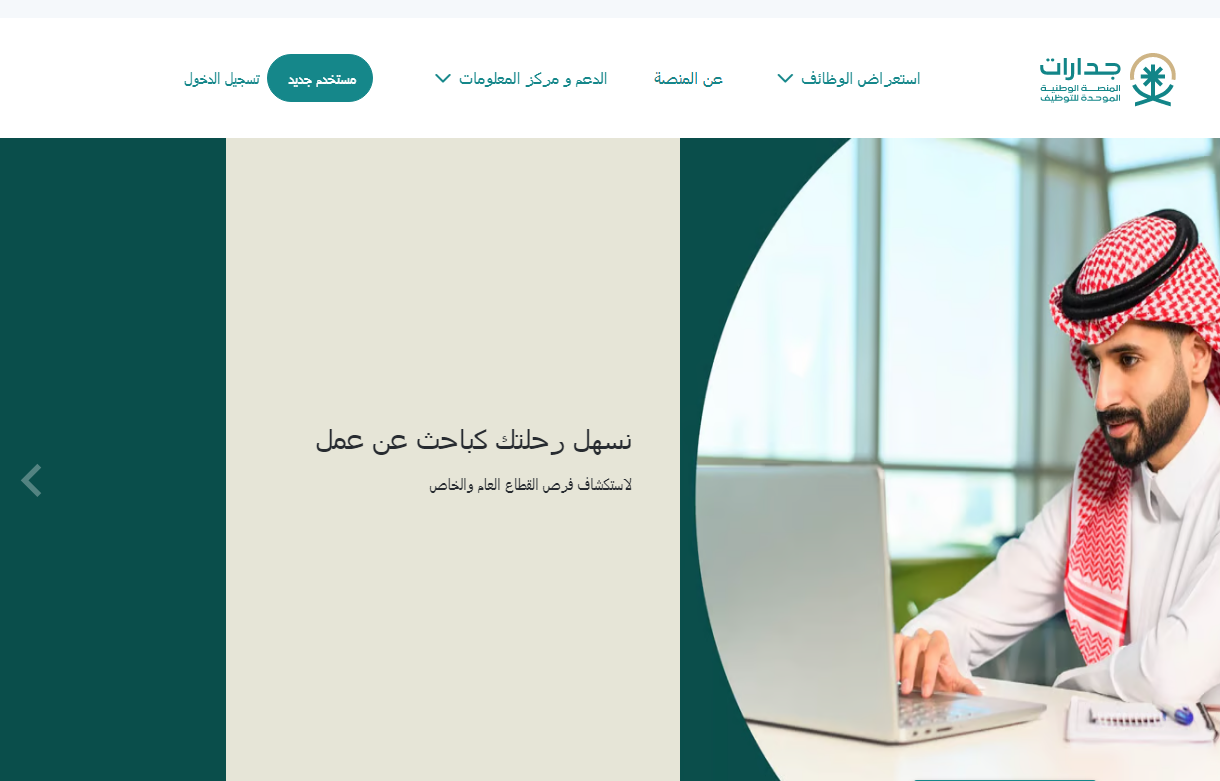 في البداية نقوم بإنشاء حساب جديد في منصة جدارات، وهي تكون المنصة الرسمية للقيام بالتسجيل في الوظائف الحكومية في المملكة العربية السعودية.