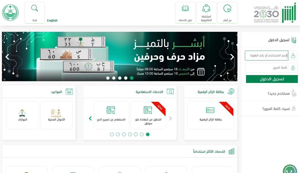 توجه إلى موقع أبشر الرسمي وقم بتسجيل الدخول إلى حسابك الشخصي باستخدام اسم المستخدم وكلمة المرور.