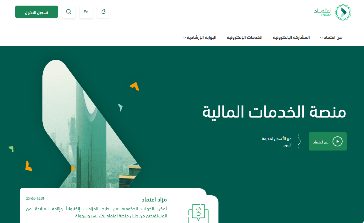 تتيح منصة اعتماد الإلكترونية رابطا مباشرا للمواطنين والمقيمين في المملكة العربية السعودية لتسجيل الدخول والاستفادة من مجموعة من الخدمات الإلكترونية المتعلقة بالمعاملات المالية الحكومية للدخول إلى حسابك، اتبع الخطوات التالية: