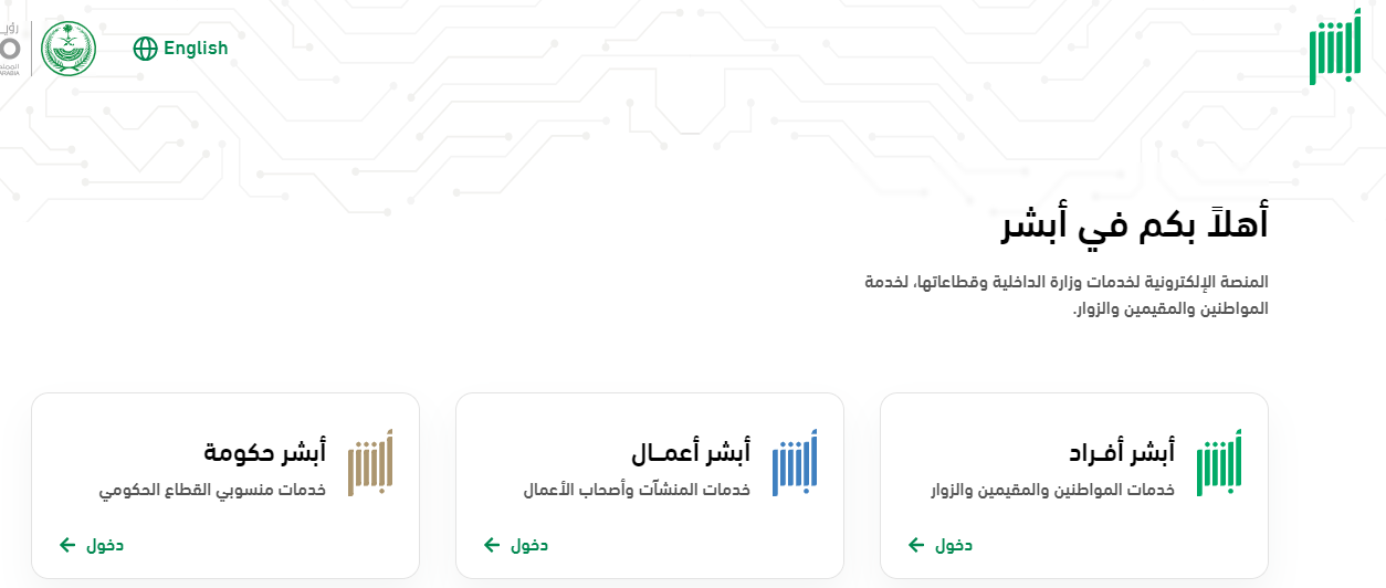 في البداية انتقل إلى الموقع الرسمي لمنصة أبشر بشكل مباشر.