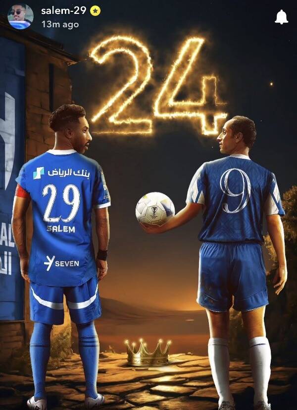 وهنا احتفل الدوسري بطريقة مميزة من خلال حالة شاركها على سناب شات؛ حيث فيها يظهر هو والجابر بقميص الهلال ولكنه يتسلّم منه الكرة ومن أمامها مكتوب رقم 24.