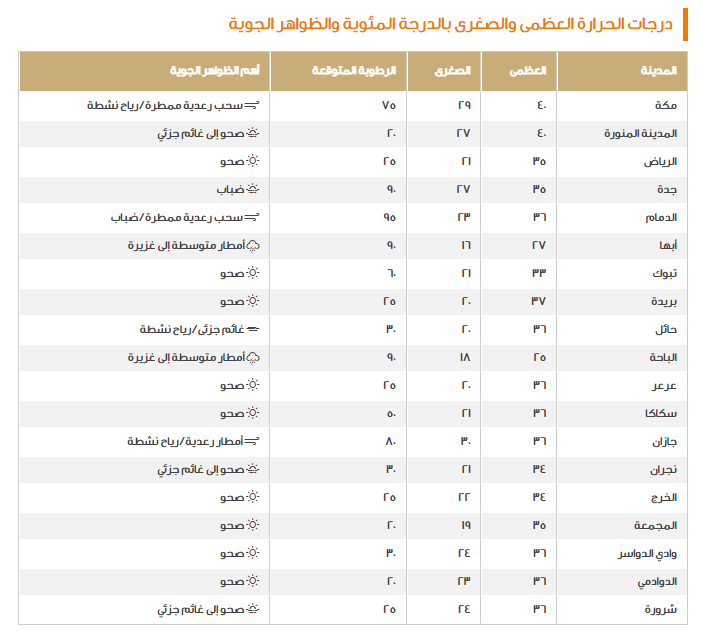وعلى صعيدٍ آخر تم التنويه على أن هناك فرص هطول الأمطار في أجزاء من المنطقة الشرقية حيث تتكون فيها سحبٌ رعدية، كما تمت الإشارة إلى بيان بدرجات الحرارة في مختلف المناطق على النحو التالي: