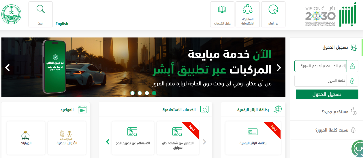 في البداية، توجه إلى موقع أبشر الإلكتروني من خلال الضغط على هذا الرابط.