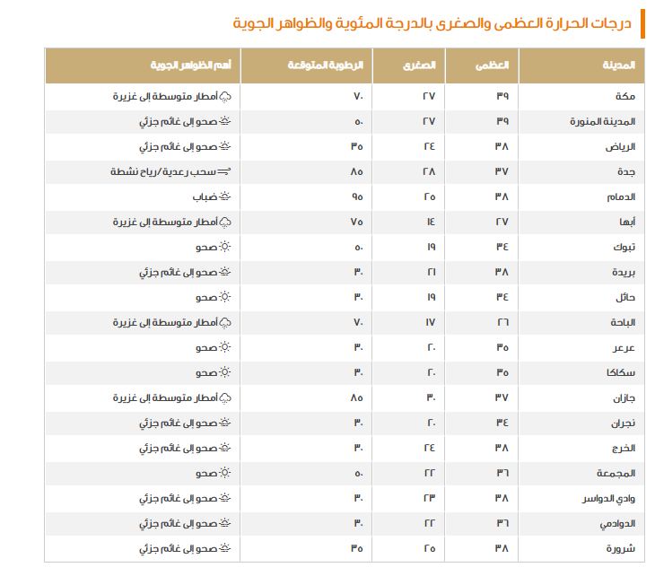 أيضًا تطرقت الأرصاد إلى بيان تفصيلي لآخر درجات الحرارة المرصودة في المحافظات المختلفة، وهي ما جاءت على النحو التالي: