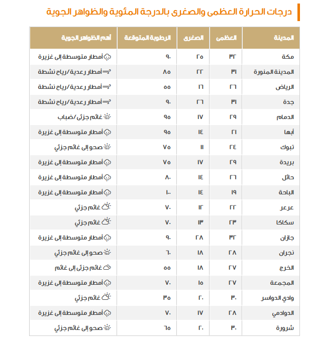 تمت المتابعة في هذا البيان بالتأكيد على أن الضباب الذي يتكون في الصباح الباكر والليل المتأخر هو ما يؤدي إلى عدم القدرة على الرؤية السليمة الواضحة على المستوى الأفقي في المناطق السابقة، وآخر ما سيتم ذكره هي درجات الحرارة التي تمثلت فيما يلي: