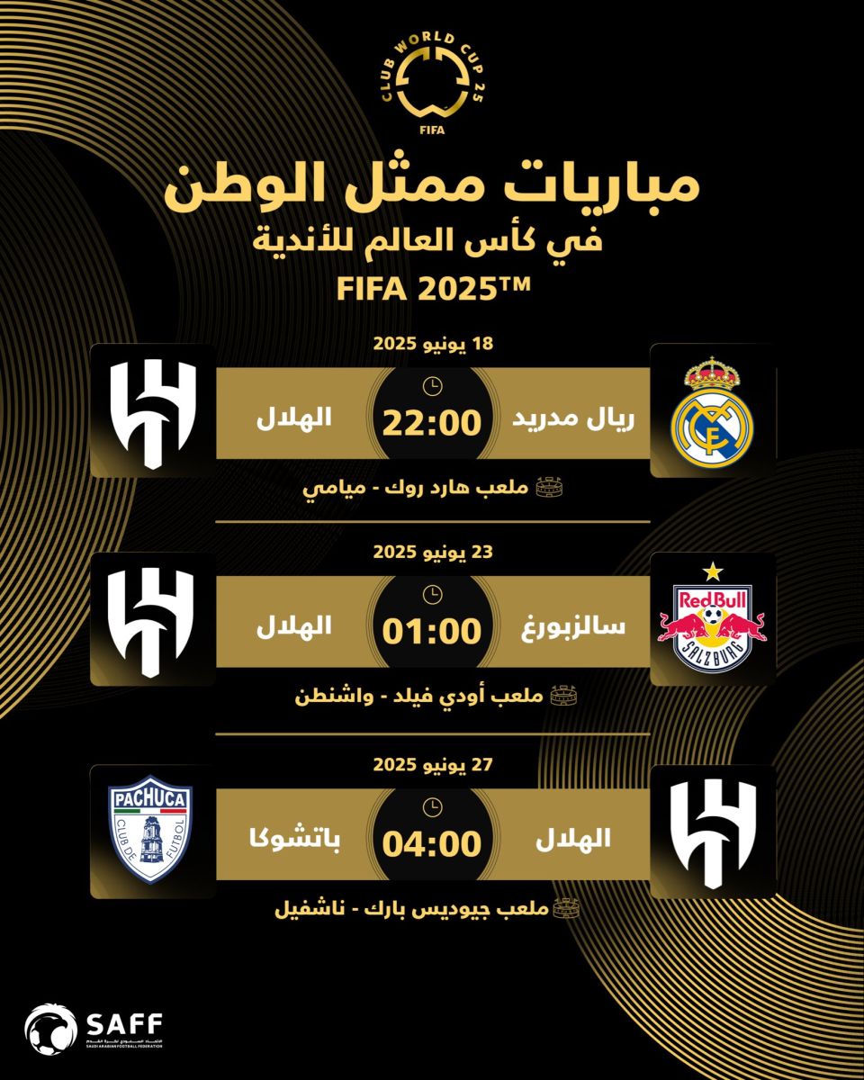 أعلن الاتحاد الدولي لكرة القدم "فيفا" رسمياً عن مواعيد مباريات نادي الهلال السعودي، ممثل الوطن العربي وآسيا، في بطولة كأس العالم للأندية 2025، التي ستقام في الولايات المتحدة الأمريكية.