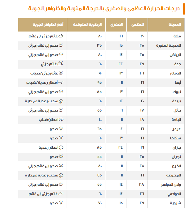 هذا وقد تمت الإشارة من قِبل المركز الوطني للأرصاد إلى أن الرياح النشطة عالية السرعة بأكثر من 50 كم/ ساعة هي ما تشهدها مناطق متفرقة مثل؛ مكة المكرمة، عسير، جازان والباحة، هذا مع وجود احتمالات لسقوط الأمطار الرعدية على كلٍ من الرياض، المنطقة الشرقية والقصيم.