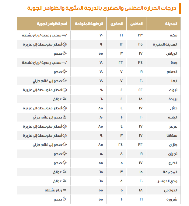 إذ أشارت الأرصاد السعودية إلى أن الحالة المطرية التي تجتاح مناطق حائل، الحدود الشمالية، المدينة المنورة، تبوك والجوف؛ حيث إنها تكون عبارة عن أمطار رعدية خفيفة لكنها تصل إلى السيول، كذلك حذرت من زخات البرد التي تصاحبها مع الرياح النشطة بما يصل إلى 55 كم/ ساعة وذلك على الرياض، مكة المكرمة والقصيم.