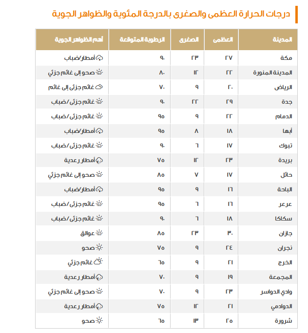 يُذكر أيضًا أن بيان الأرصاد السعودية قد تضمن تحذير من أن الرياح السطحية ذات السرعة التي تصل إلى 55 كم/ ساعة وأكثر مع زخات من البرد، كما تم التشديد على ضرورة ارتداء الملابس الثقيلة لأن درجات الحرارة في انخفاض ملموس وذلك كما هو موضح على النحو التالي: