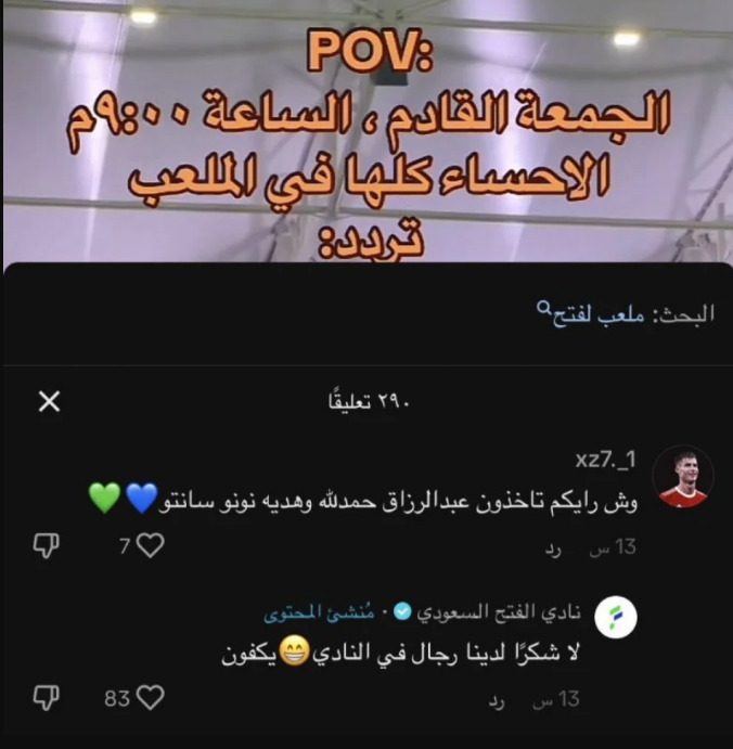 نشر نادي الفتح السعودي مقطع فيديو عبر منصة "تيك توك" على حسابه الرسمي بخصوص تواجد جماهير الفريق في المدرجات بداية من مباراة النادي القادمة، وتم التعليق عليها بعبارة: "الجمعة القادم الساعة 9 مساءً الأحساء كليًا في الملعب تردد: "سنعود يومًا ما".