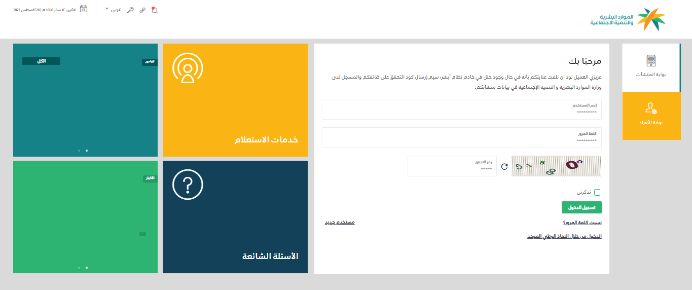 - قم بالذهاب إلى الموقع الرسمي الإلكتروني لبوابة الخدمات الإلكترونية لوزارة الموارد البشرية والتنمية الاجتماعية.