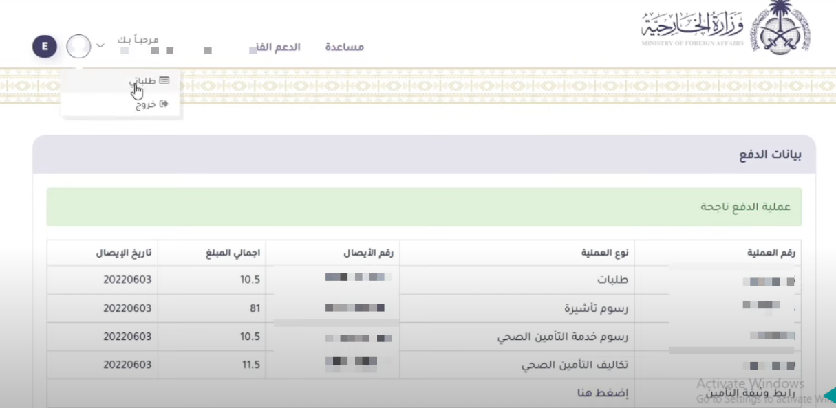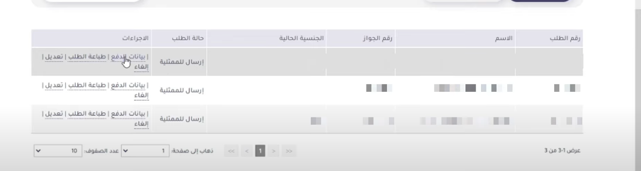 - عند التأشيرة المراد تعديل الطلب، قمّ بالنقر على زر "طباعة بيانات الدفع".