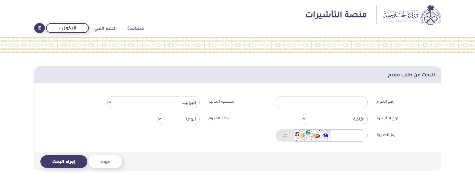 - أدخل رقم الطلب، ورقم جواز السفر، والرمز المرئي.