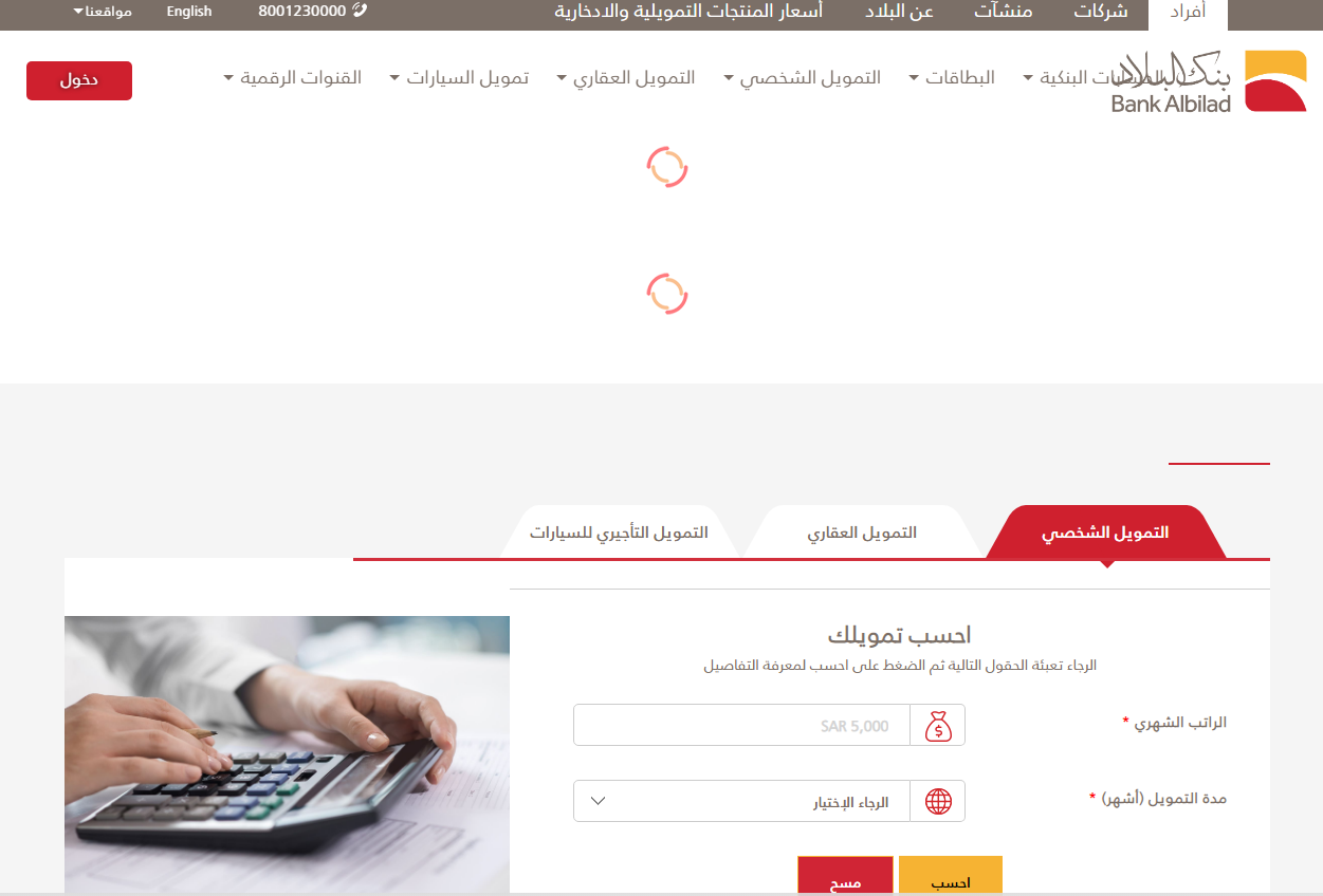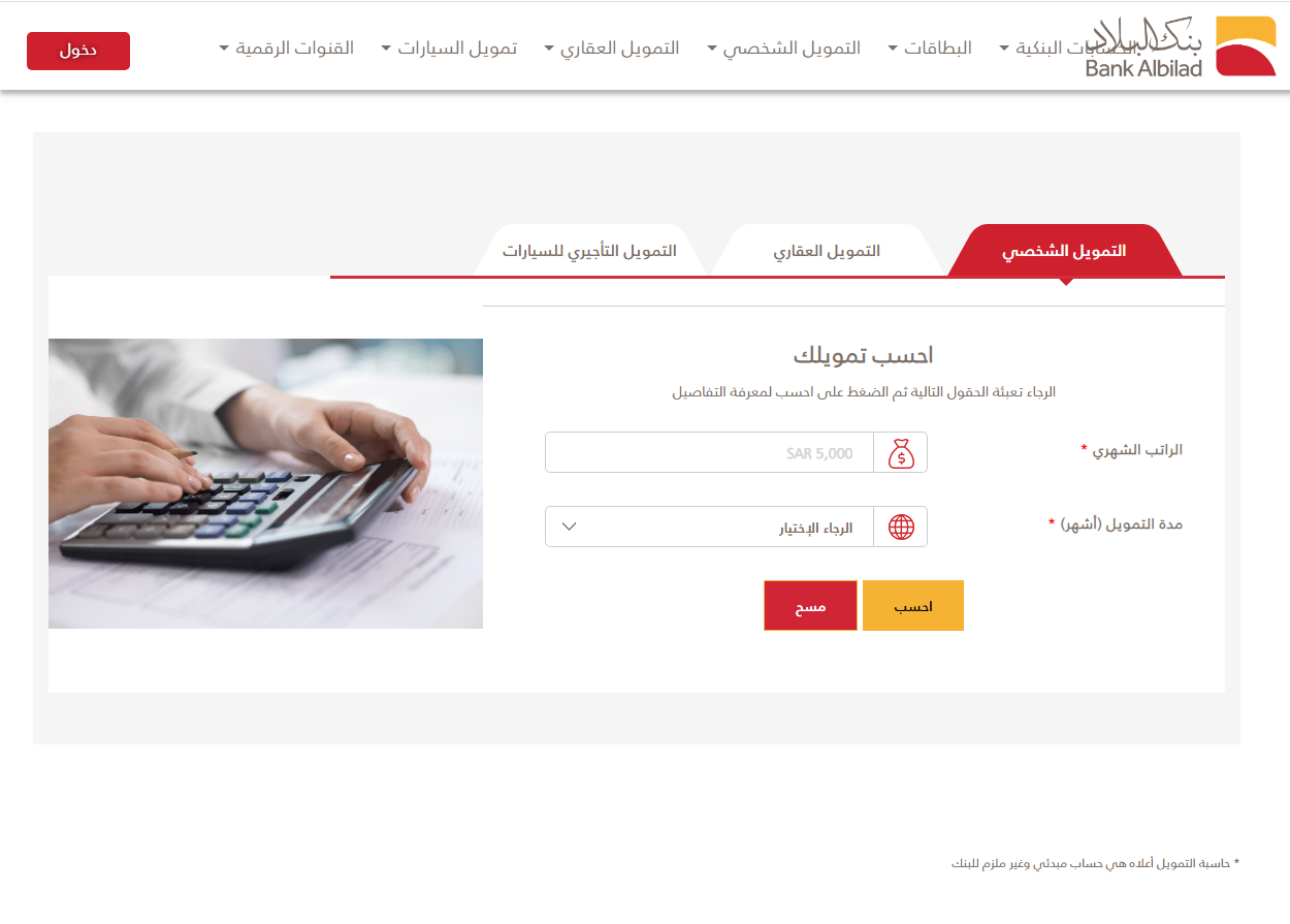 - هذه الحاسبة يوجد مثلها لكل أنواع التمويل التي يقدمها البنك