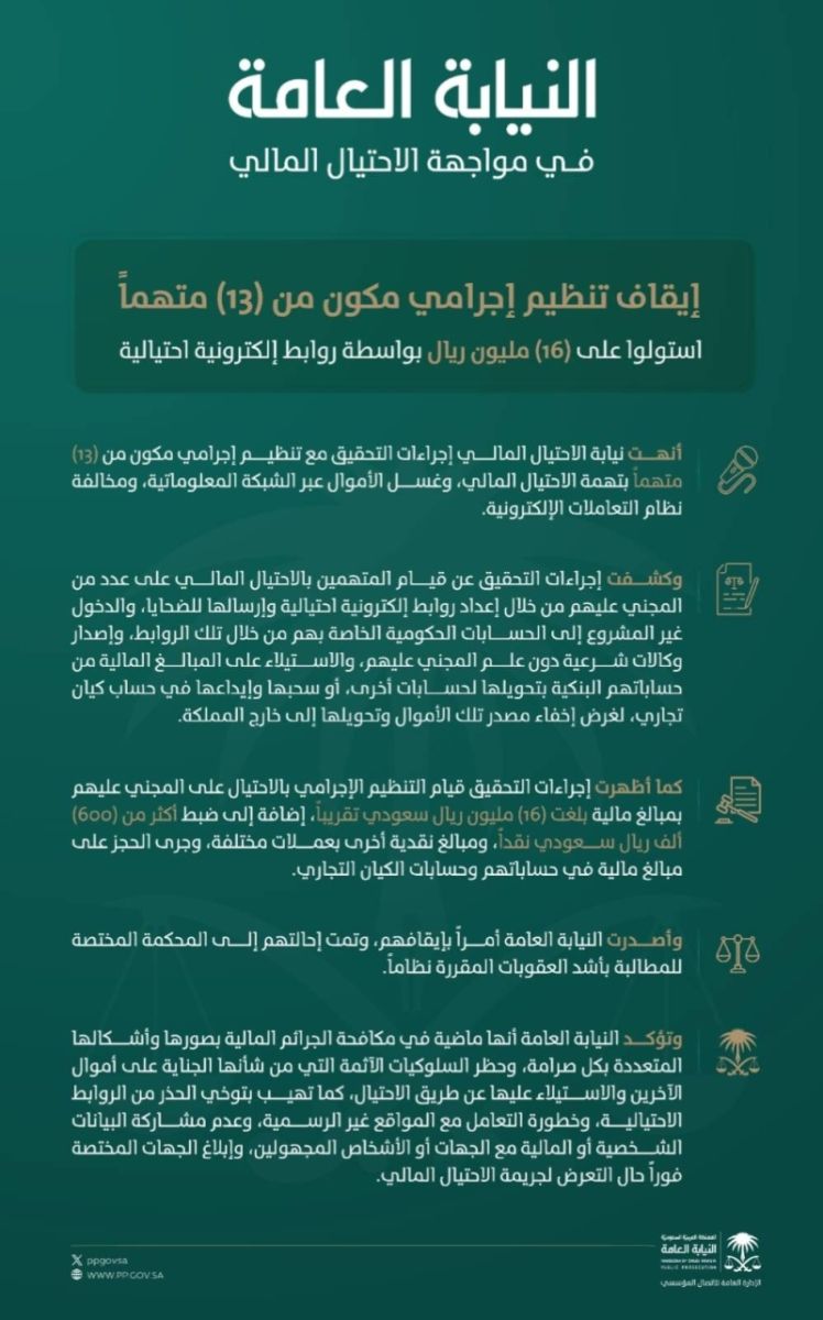 وقد أصدرت النيابة العامة بالمملكة العربية السعودية أمر رسمي بتوقيفهم واحتجازهم وعلى الفور تمت إحالتهم للقضاء وجاري اتخاذ العقوبات اللازمة بحقهم وفقًا لقانون الاحتيال المالي في المملكة.