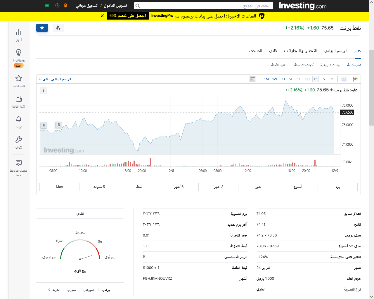ووضح أن سعر عقود نفط برنت في السعودية هي 75.65 دولار أمريكي أي أنه زاد بقيمة 2.16% ولذا فإن توصيات الخبراء تتجه نحو البيع بقوة.