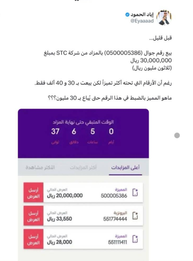 قام الناشط في منصة إكس وهو إياد الحمود بالتعبير عن الاستغراب من أمر بيع جوال في مزاد لشركة stc للاتصالات السعودية، وتم البيع بمبلغ 30 مليون ريال.