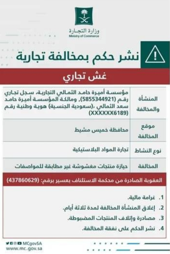 أعلنت وزارة التجارة السعودية عن بيان قامت من خلاله بالتشهير بمؤسسة أميرة حامد الثمالي التجارية في محافظة خميس مشيط.