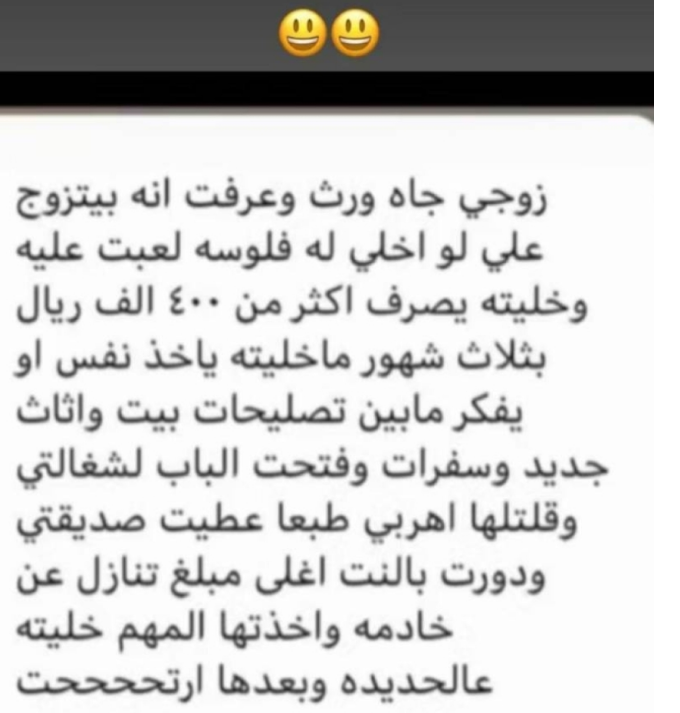 "لعبت عليه وخليته يصرف أكثر من400 ألف ريال في ثلاث شهور ما خليته يأخذ نفس أو يفكر ما بين تصليحات بيت وأثاث جديد وسفرات وفتحت الباب لشغالتي وقلتلها اهربي طبعًا عطيت صديقتي".