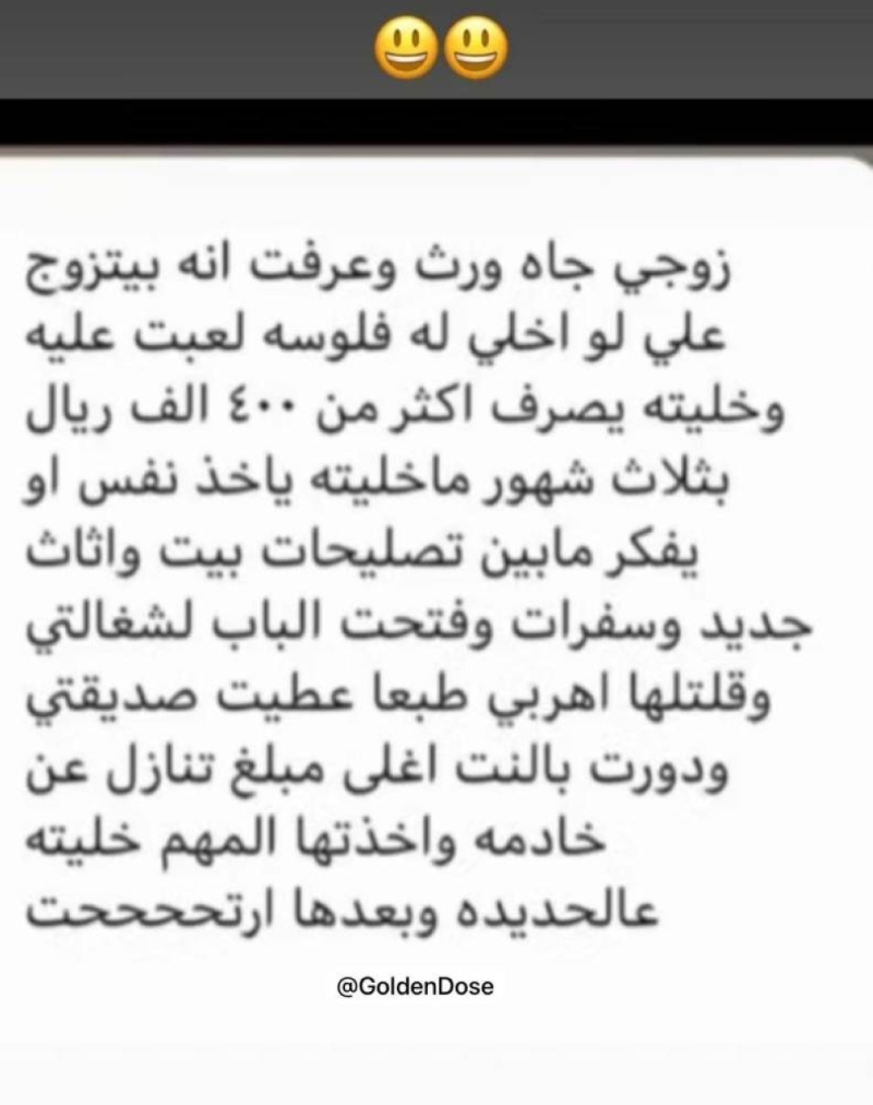 كشفت زوجة أحد المواطنين السعوديين عن خطتها التي نوت أن تنفذها بعد أن علمت أن زوجها يرغب في الزواج من امرأة أخرى عليها بعد أن حصل على ورث وذلك من خلال المنشور الذي أرسلته الزوجة لعدة صفحات والتي قالت بها: "زوجي جاه ورث وعرفت أنه بيتزوج علي لو اخلي له فلوسه".